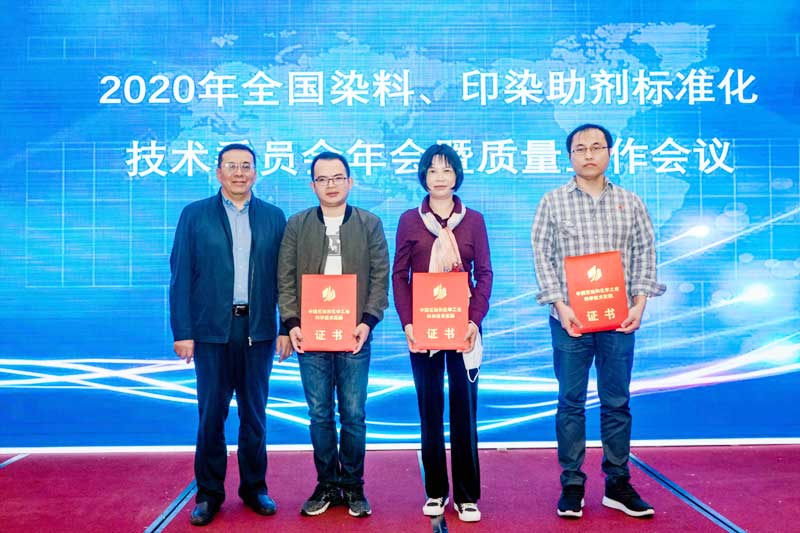 會議期間,受全國染料標準化技術委員會主任委員、沈陽院院長胥維昌教授委托,沈陽院沈化測評總經理蔡磊明博士作《染標委“十三五”期間染料標準化工作總結報告》,對“十三五”期間染標委工作給予充分肯定,為染標委今后工作明確重點和目標。沈陽院沈化測評呂雙高工作《染料行業(yè)綠色標準體系建設要點解讀》報告,沈陽院沈化測評王勇教高作《反應染料軋染固色率測定方法解析》報告,報告內容豐富精彩,受到與會代表熱烈歡迎。大會還通報了2019年—2020年最新發(fā)布的染料行業(yè)國家標準和化工行業(yè)標準,同時向2019年—2020年獲獎單位和標準起草單位頒發(fā)獲獎證書和《標準起草證書》。