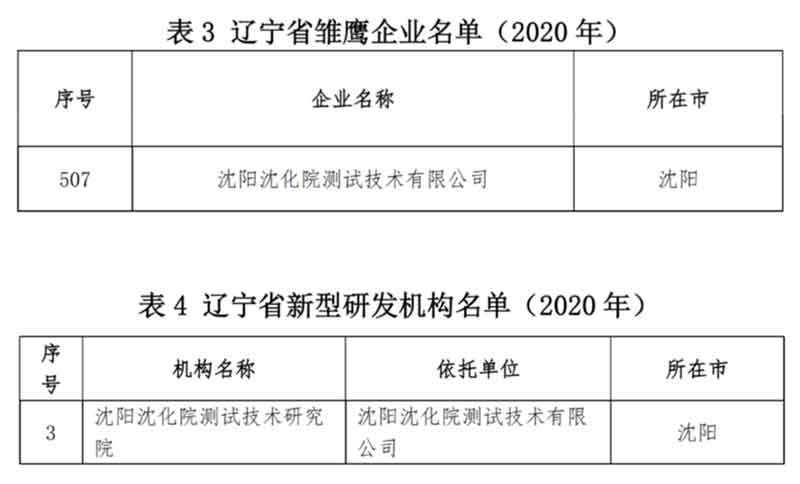 12月7日,沈陽院下屬沈陽沈化院測試技術有限公司(簡稱沈化測評)入選遼寧省雛鷹企業(yè)、遼寧省新型研發(fā)機構兩個榜單。這是繼通過國家科技型中小企業(yè)認定、高新技術企業(yè)認定后,沈化測評取得的又一重要資質和成果。