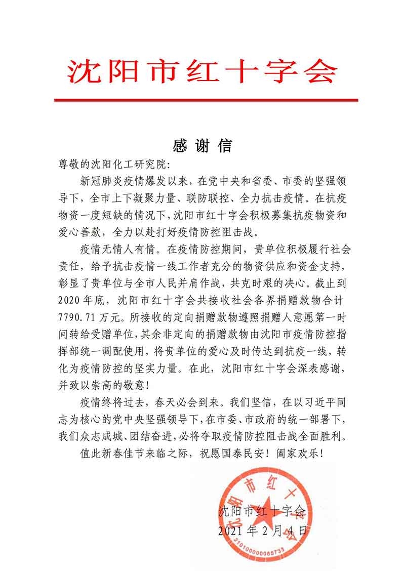 2月4日,沈陽市紅十字會(huì)致信沈陽院,感謝沈陽院在2020年沈陽市打贏疫情防控阻擊戰(zhàn)中做出的積極貢獻(xiàn)。感謝信中說,沈陽院積極履行社會(huì)責(zé)任,給予抗擊疫情一線工作者充分的物資供應(yīng)和資金支持,彰顯了沈陽院與全市人民并肩作戰(zhàn),共克時(shí)艱的決心。
