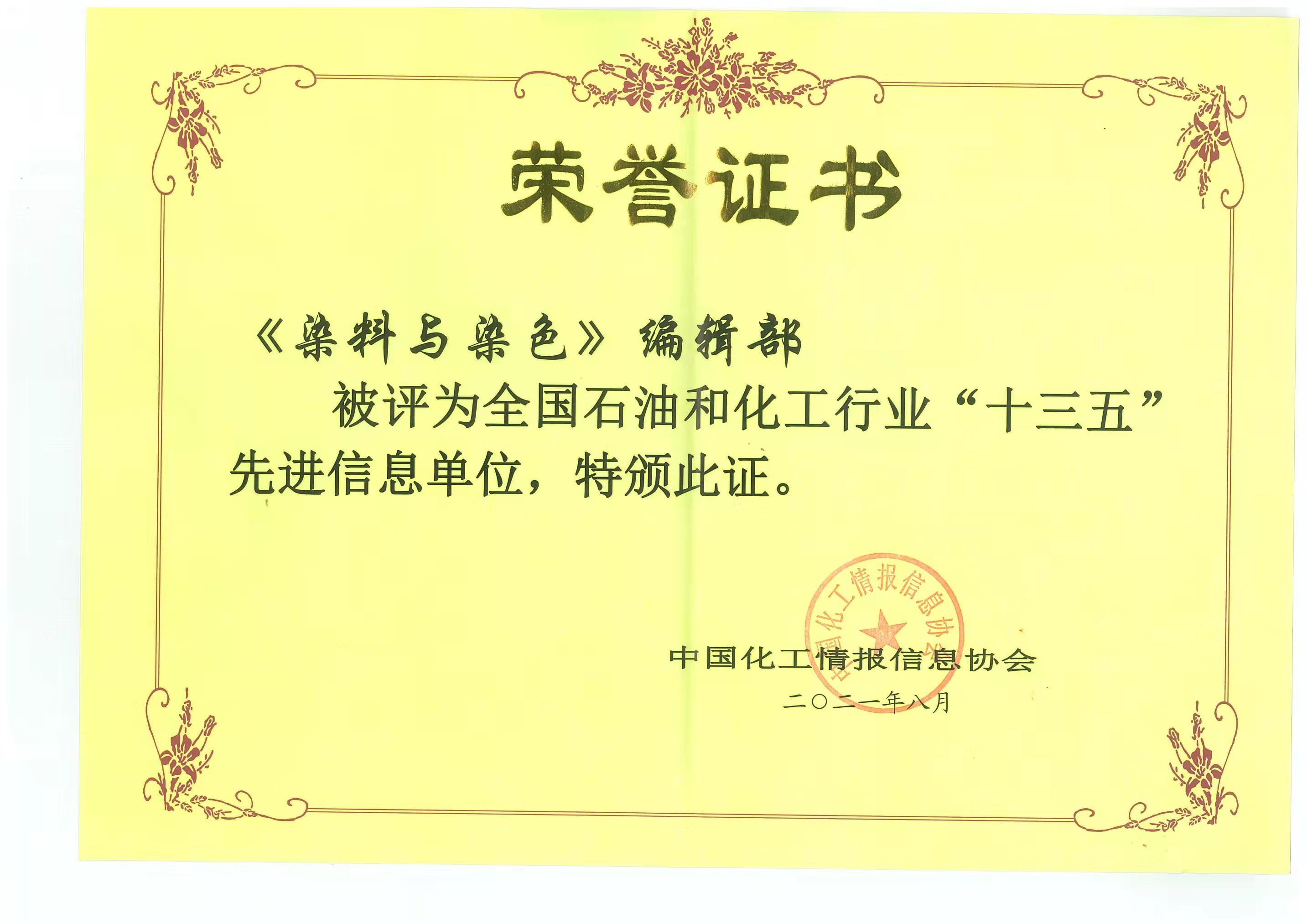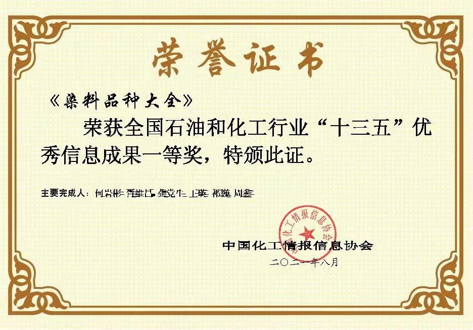 日前,全國石油和化工信息系統(tǒng)“十三五”經(jīng)驗(yàn)成果評選結(jié)果正式公布?!度玖吓c染色》期刊編輯部榮獲“先進(jìn)信息單位”稱號;大型染料工具書《染料品種大全》榮獲“優(yōu)秀信息成果一等獎”;沈陽化工研究院院長,染料國家工程研究中心、中國化工協(xié)會染料專業(yè)委員會主任,全國染料工業(yè)信息中心負(fù)責(zé)人、《染料與染色》主編胥維昌榮獲 “先進(jìn)信息工作者”稱號。