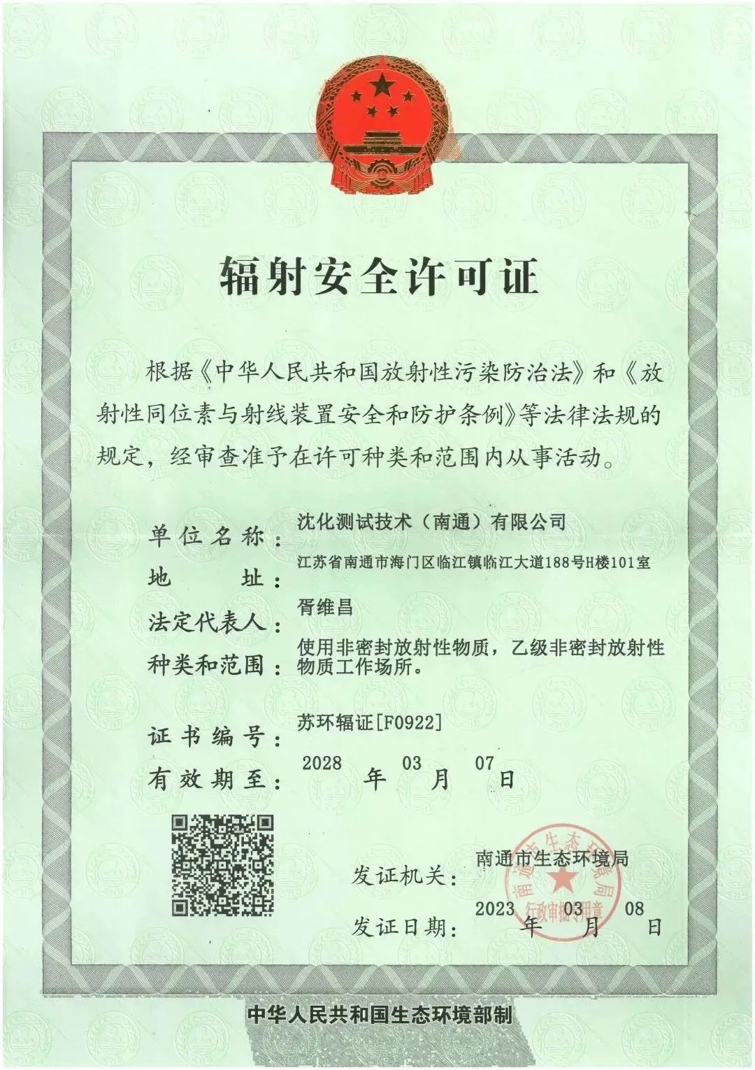 近日,沈陽院沈化測試技術(shù)(南通)有限公司獲得江蘇省南通市生態(tài)環(huán)境局許可的《輻射安全許可證》。至此,測評南通公司正式具備了利用放射性核素開展核素標(biāo)記合成實(shí)驗(yàn)和藥物代謝示蹤實(shí)驗(yàn)的法定條件。