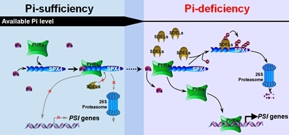 論文第一作者、資劃所副研究員阮文淵介紹,兩類(lèi)蛋白(SDELs和PHRs)和一類(lèi)多聚磷酸肌醇(IPs)分子共同調(diào)控磷素感受器SPX4的穩(wěn)定性。當(dāng)外界磷素供應(yīng)充足時(shí),由于細(xì)胞內(nèi)IPs含量高,其介導(dǎo)了SPX4與PHR2形成穩(wěn)定復(fù)合體,導(dǎo)致SDELs不能有效識(shí)別SPX4,從而阻礙了SPX4的泛素化修飾,SPX4得以穩(wěn)定存在。與此同時(shí),復(fù)合體的形成抑制了PHRs對(duì)下游磷饑餓誘導(dǎo)基因的激活,使磷饑餓應(yīng)答程序處于靜息狀態(tài)。當(dāng)磷素匱乏時(shí),復(fù)合體逐步解聚,使得SDELs能有效識(shí)別游離的SPX4蛋白并介導(dǎo)其降解。同時(shí)缺磷誘導(dǎo)SDELs蛋白積累,加速SDELs對(duì)SPX4進(jìn)行泛素化修飾,并通過(guò)26S蛋白酶體途徑對(duì)SPX4進(jìn)行降解。從復(fù)合體釋放出來(lái)的PHRs能有效結(jié)合下游調(diào)控基因的啟動(dòng)子,從而啟動(dòng)磷素匱乏應(yīng)答程序以應(yīng)對(duì)低磷脅迫。