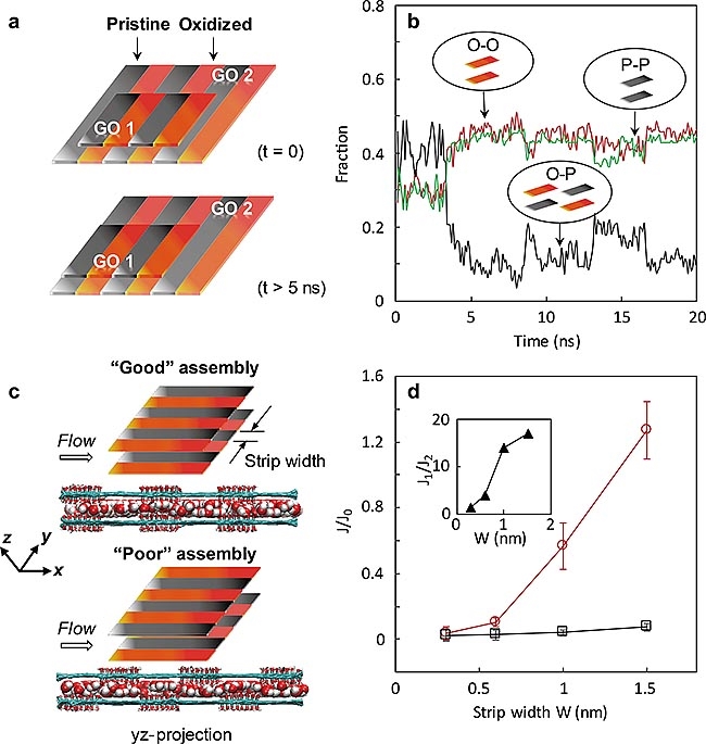 通過計(jì)算機(jī)模擬他們發(fā)現(xiàn),氧化區(qū)對氧化區(qū),非氧化區(qū)對非氧化區(qū)的結(jié)構(gòu)在熱力學(xué)上更加穩(wěn)定,隨著時(shí)間的推移更易組裝成這樣的結(jié)構(gòu)。同時(shí),對于慢速抽濾得到的組裝結(jié)構(gòu)隨著條寬的增加會(huì)使通量急劇上升。