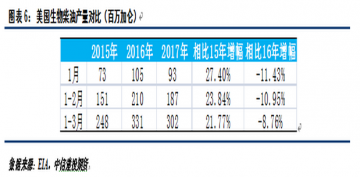2、 美生物柴油政策將作何調(diào)整?因原油走低利潤下滑,且受源自阿根廷、印尼的生物柴油進(jìn)口沖擊,2017年美國生物柴油生產(chǎn)較2016年有所萎縮。根據(jù)EIA 5月底最新公布的數(shù)據(jù),美國生物柴油在2017年前3月產(chǎn)量為3.02億加侖,而去年為同期3.31億加侖,2015年同期為2.48億加侖,值得慶幸的是,一季度環(huán)比產(chǎn)量雖為下滑,但下滑幅度較前月減少,且相較于2015年仍有超過20%的增幅。