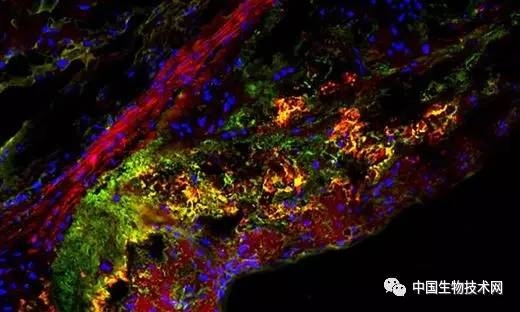 小鼠主動(dòng)脈的橫截面,我們能看到大塊斑塊。紅色直線是主動(dòng)脈壁。黃色的區(qū)域是巨噬細(xì)胞正在清理細(xì)胞廢物。