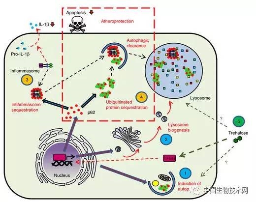 在該研究中,Razani和同事發(fā)現(xiàn),海藻糖能夠激活一種名為TFEB的分子。被激活的TFEB分子會(huì)進(jìn)入巨噬細(xì)胞的細(xì)胞核并與DNA綁定。這種綁定作用會(huì)激活特定的基因,引起一連串的事件,這些事件會(huì)導(dǎo)致產(chǎn)生額外的清理機(jī)制,更多的細(xì)胞器起到了垃圾清理和收集的作用。