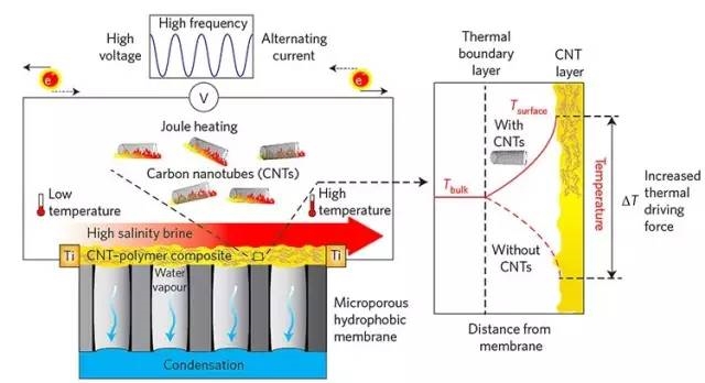 本文研究者抓住了膜蒸餾中的一個關鍵問題:如何保持膜兩側(cè)較高的溫度差(即驅(qū)動力)?他們想到的辦法是:在膜的蒸發(fā)一側(cè)安一個加熱器,而這層加熱器由碳納米管所組成。其加熱原理為焦耳加熱,即電流通過導體時因電阻所引起的發(fā)熱現(xiàn)象。