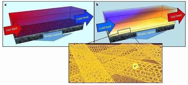 常規(guī)(a)和帶碳納米管加熱器(b)的膜蒸餾過程。圖片來源:Nature Nanotech.