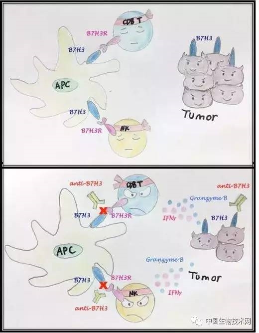 人體內的免疫效應細胞(如CD8+ T淋巴細胞和NK細胞——自然殺傷細胞)可以識別并殺傷癌細胞,但它們的殺傷功能往往被它們激活后上調的免疫檢查點分子(如PD-1、CTLA-4和Tim-3)所抑制。拮抗免疫檢查點的藥物(如PD-1、CTLA-4中和抗體)在多種癌癥的臨床試驗中有突出的療效并已獲美國FDA批準用于黑色素瘤、非小細胞肺癌等疾病的治療。但只有一小部分的病人在用藥后可以產生較好的應答,另外一大部分病人在短暫應答之后癌癥繼續(xù)惡化,這提示我們可能還有其它免疫檢查點分子參與抵御免疫殺傷,也可以作為腫瘤免疫治療或聯(lián)合治療的藥物靶點。B7-H3是B7蛋白家族的一員,與PD-L1(PD-1的配體)有28%的序列同源性,董晨等研究組之前研究表明B7-H3調控T細胞活化,它在腫瘤組織中的表達與疾病進展和預后相關。然而,B7-H3在抗腫瘤免疫應答中的功能和作用機制尚未研究清楚,B7-H3的受體也未確定。