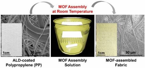 為此,Dennis Lee、Gregory N. Parsons及其同事嘗試了在室溫下將MOF“生長”在織物上,從而創(chuàng)造出可用于制服和防護(hù)服的輕質(zhì)“盾牌”。
