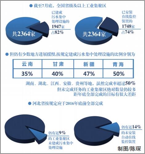 截至7月底,全國省級及以上工業(yè)集聚區(qū)共2364家,已建成污水集中處理設(shè)施的1947家,占82%;已安裝在線監(jiān)控裝置的共1748家,占74%。但仍有少數(shù)地方進(jìn)展緩慢,云南、甘肅、新疆、青海等地按規(guī)定建成污水集中處理設(shè)施的比例分別為35%、40%、47%、50%;湖南、湖北、江西、安徽、貴州等地,雖然完成率超過50%,但未完成任務(wù)的工業(yè)集聚區(qū)絕對數(shù)量仍較多,距年底全部完成的目標(biāo)有很大差距;河北省按規(guī)定應(yīng)于2016年底前全部完成,但仍有近9%的工業(yè)集聚區(qū)未建成污水集中處理設(shè)施,近14%的未安裝自動在線監(jiān)控裝置。