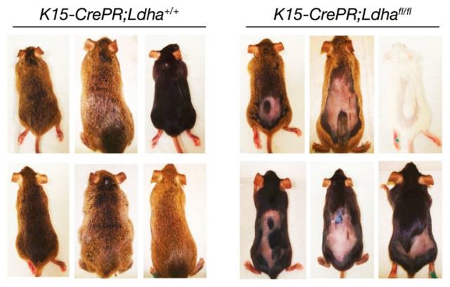 LDHA基因敲除的小鼠(右)與對(duì)照組相比(左),無(wú)法開(kāi)啟正常的毛發(fā)生長(zhǎng)周期(每種基因型有超過(guò)33只小鼠,并確保毛囊周期一致)