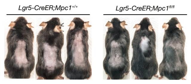 研究人員通過(guò)敲除Mpc1基因(Mpc1是丙酮酸進(jìn)入線粒體所需的轉(zhuǎn)運(yùn)蛋白,其功能喪失會(huì)增加丙酮酸轉(zhuǎn)化成乳酸)創(chuàng)建Mpc1功能缺失的小鼠模型,來(lái)增加毛囊干細(xì)胞的乳酸產(chǎn)生。結(jié)果顯示,與同窩同期對(duì)照小鼠相比,Mpc1功能缺失的小鼠腹側(cè)和背部毛發(fā)在脫落之后(毛囊休止期),強(qiáng)烈加速開(kāi)啟新一輪毛發(fā)生長(zhǎng)。
