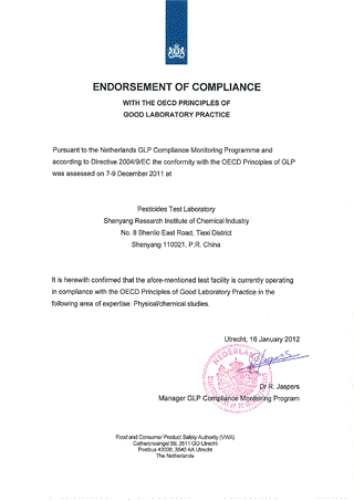 沈陽院glp評價機構(gòu)在國家相關(guān)部委、地方政府部門的大力支持下,通過了oecd成員荷蘭政府的glp國際認(rèn)證,其意義深遠。它實現(xiàn)了安全性評價試驗數(shù)據(jù)在國際上的雙邊或多邊互認(rèn),徹底解決了我國向歐盟出口化學(xué)品的安全性評價工作只能依靠國外的glp實驗室檢測的問題,將直接降低國內(nèi)同類化學(xué)品進行國際相關(guān)認(rèn)證的檢測成本,縮短其認(rèn)證的時間,進而對推動我國農(nóng)藥產(chǎn)品以自主品牌在國外取得登記出口,提高自主知識產(chǎn)權(quán)醫(yī)藥、農(nóng)藥等產(chǎn)品的價格,最終為對提高目前國內(nèi)整個醫(yī)藥、農(nóng)藥、食品、化妝品、獸藥等行業(yè)的全球銷售額有著積極推動作用。同時對實現(xiàn)我國安全評價試驗的標(biāo)準(zhǔn)化、規(guī)范化以及保障環(huán)境安全和公眾健康有著重要意義。